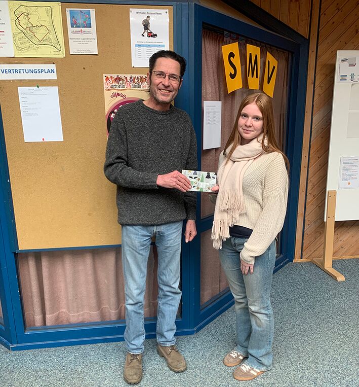Anlässlich seines 30-jährigen Bestehens ließ unser Förderverein ein Banner für öffentliche Auftritte erstellen. Hierzu wurden die Schüler und Schülerinnen der Hermann-Hesse-Schule gebeten, Motive zu entwerfen. Die Wahl fiel schließlich auf einen Entwurf von Sophie Kl. 10, der verbildlicht, wie Schüler und Schülerinnen zur Schule gehen und sie erfolgreich wieder verlassen. Als Dank überreichte der Vorstand Sophie einen Gutschein der Buchhandlung am Obertor. Auch möchten wir uns bei GM Werbung in Rielasingen für die Herstellung des Banners bedanken.