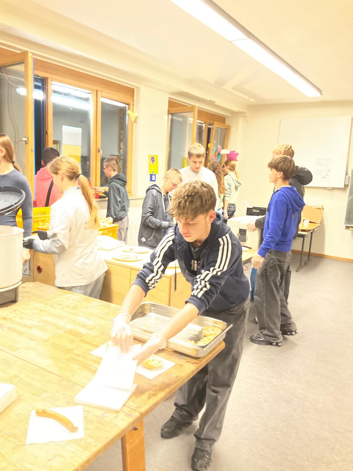 Die Klassen 9 und 10 der Hermann-Hesse-Schule waren für die Verpflegung verantwortlich, mit wärmendem Punsch, Waffeln, Pizzabrötchen und Wienerle mit Brot versorgten sie die Eltern und Kinder, den Musikverein und die Feuerwehr. Die AES Gruppe der Klasse 7 lieferten frisch gebackene Martinsgänse, die kostenlos auf dem Schulhof verteilt wurden. Die Schülerinnen und Schüler brachten sich mit viel Einsatz ein und sorgten dafür, dass die Gäste bestens versorgt wurden.